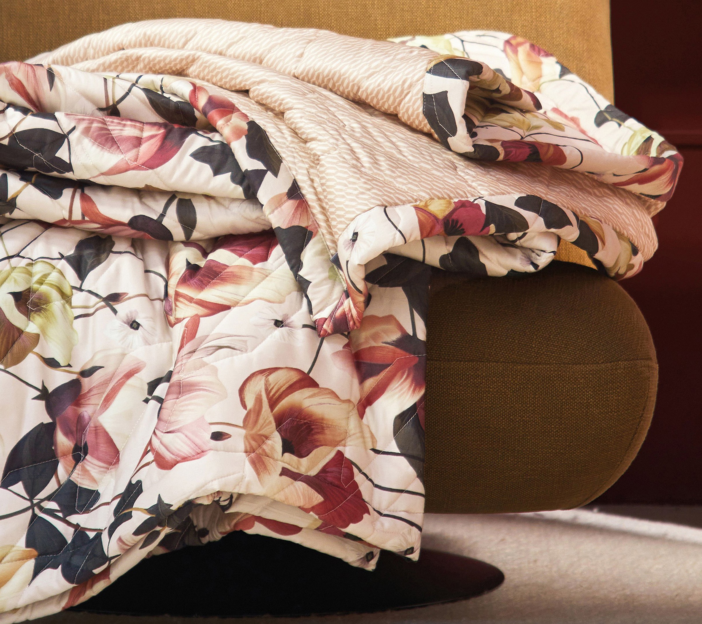 Couvre lit matelassé 270/250 cm en satin 100% coton peigné longues fibres 120 fils/cm² RHAPSODIE Aubépine, ce couvre-lit matelassé célèbre l'éclat des fleurs avec une élégance moderne. Il offre un motif floral vibrant et expressif, transformant votre chambre en un jardin intérieur. Le coloris Grenat captive par ses tonalités riches et profondes, apportant une touche de chaleur et d'intensité.