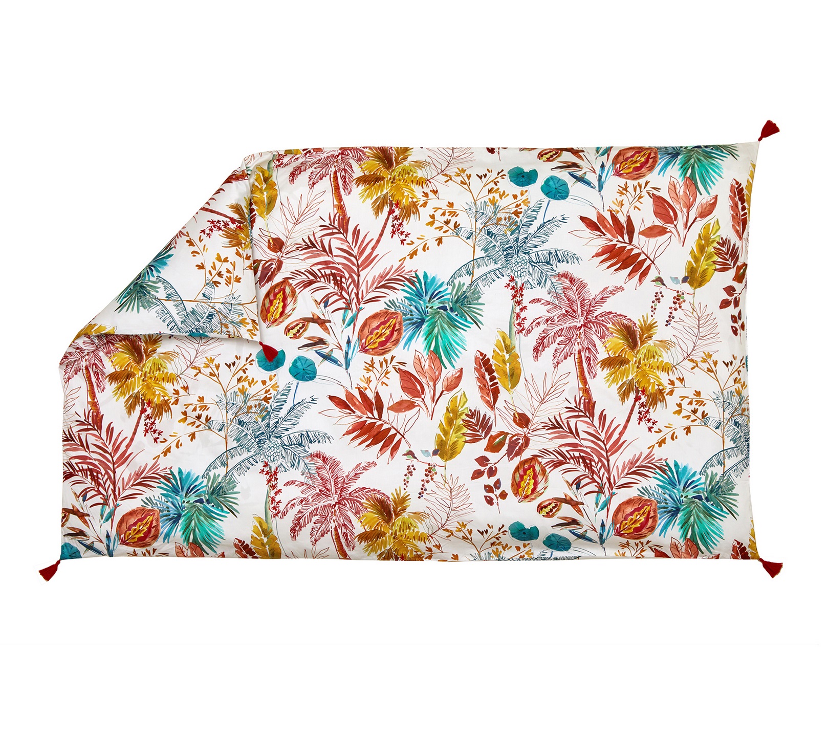 Housse de couette : rabat cheminéee, 2 faces imprimée de motifs végétaux et palmiers spectaculaires.