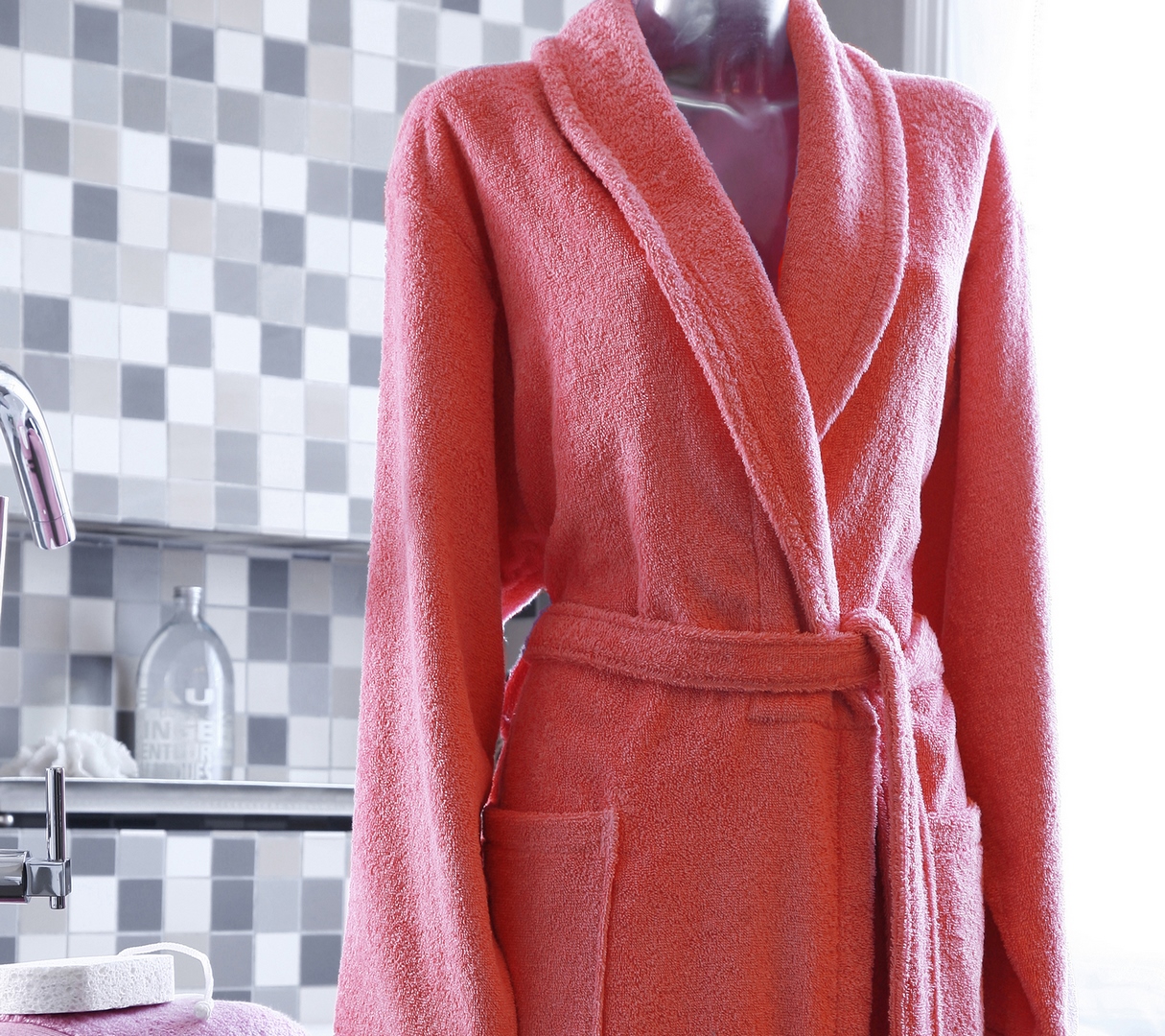 Peignoir L cm en éponge 100% coton 420 gr/m² . Ce peignoir élégant et confortable est réalisé en bouclette éponge chic et hautement absorbante/B]. Il est confectionné avec un large col châle élégant, une ceinture avec passants et 2 poches larges et confortables.