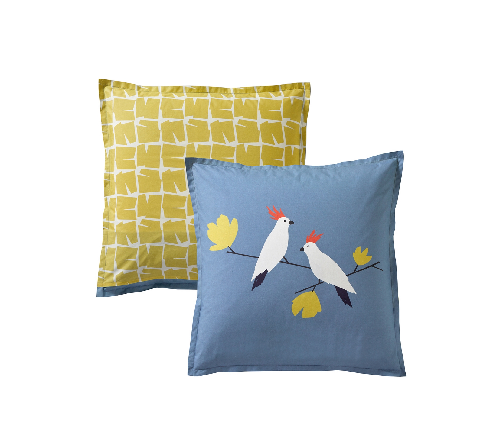 • Taie d'oreiller carrée : 1 face imprimée de perroquets installés sur des branches et l'autre face imprimée d'un motif géométrique coordonné. Finition volant plat 2 cm et large rabat pour insérer l'oreiller