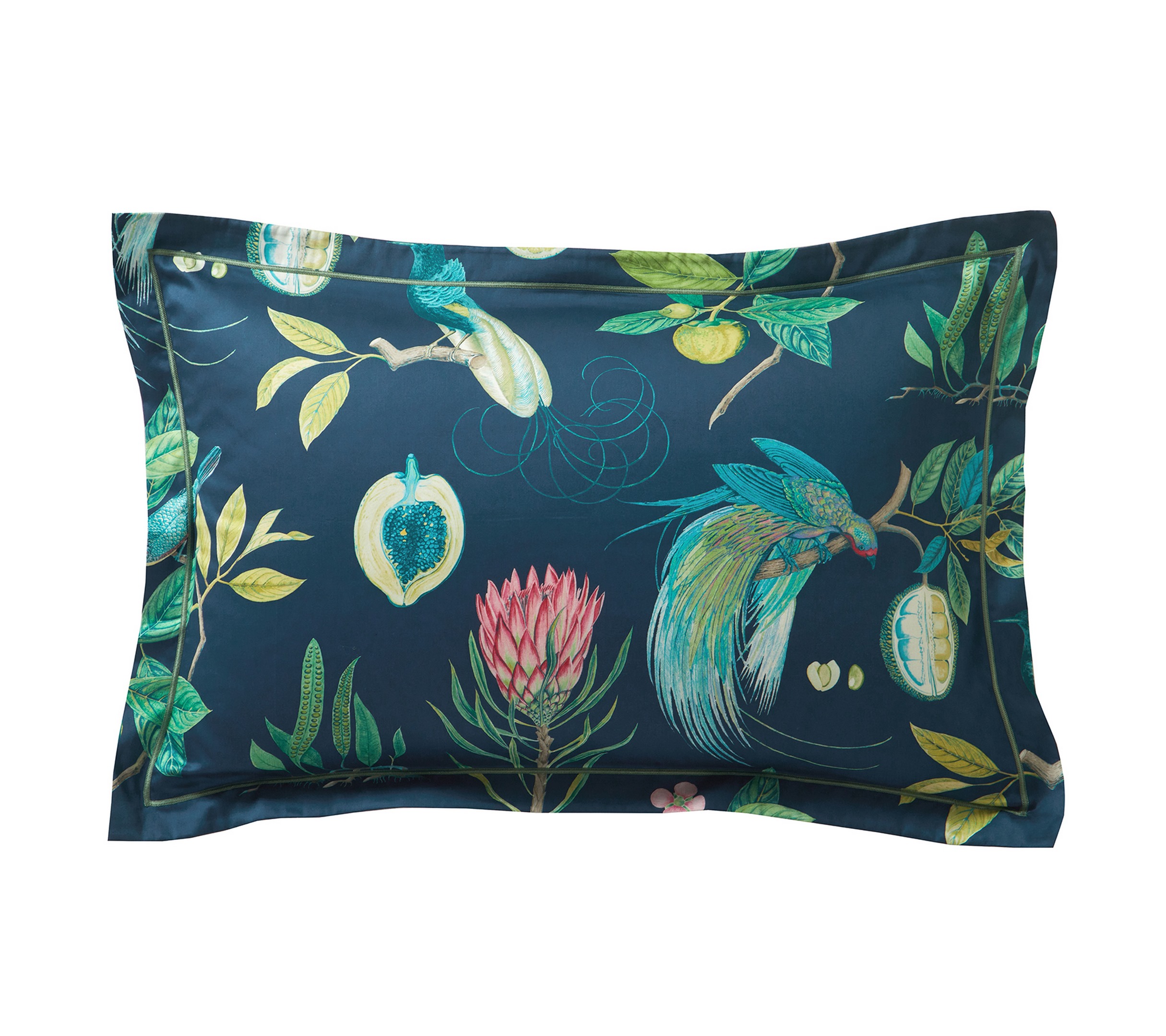 Taie 50/75 cm Satin 100% coton peigné longues fibres 120 fils/cm² . Le modèle Paradésia Emeraude vous transporte au cœur d’une nature luxuriante. Une combinaison de motifs tropicaux d'une grande richesse avec une flore exotique et une faune vibrante, où les oiseaux de paradis, magnifiquement illustrés se cachent parmi les papayes, Proteas et aux autres plantes tropicales. Chaque détail de ce tableau vivant évoque un paradis lointain, tandis que le motif coordonné, un treillis géométrique structuré, apporte une touche de modernité et de contraste à l'ensemble.