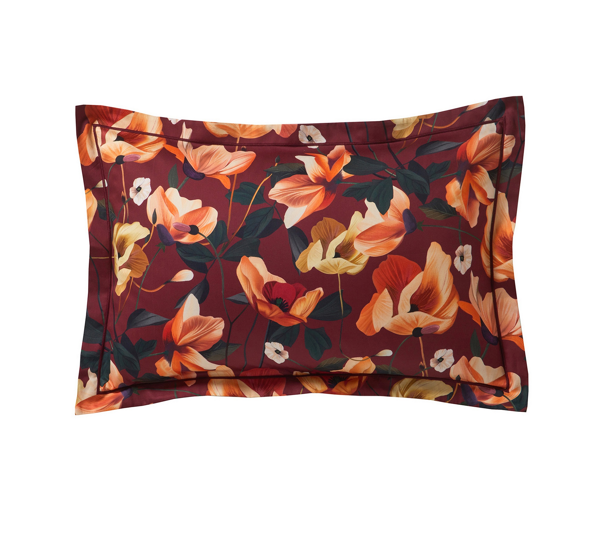 Taie 50/75 cm en satin 100% coton peigné longues fibres 120 fils/cm² RHAPSODIE Grenat célèbre l'éclat des fleurs avec une élégance moderne. Imprimée sur un satin de coton ultra doux et luxueux, elle offre un motif floral vibrant et expressif, transformant votre chambre en un jardin intérieur. Il captive par ses tonalités riches et profondes, apportant une touche de chaleur et d'intensité.