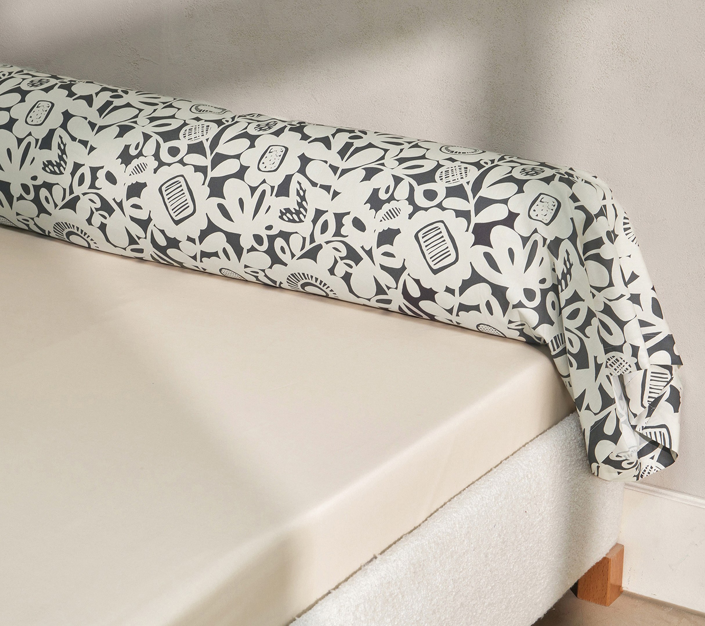 Traversin 90/190 cm en percale 100% coton peigné 80 fils/cm² . La taie de traversin KUKKIA Graphite arbore un motif floral stylisé, à la fois moderne et intemporel. Le contraste des couleurs crée un effet visuel saisissant, pour une ambiance affirmée et élégante.